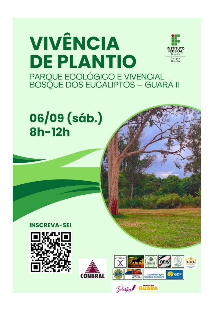 No dia 6 de setembro, das 8h às 12h, o Parque Bosque dos Eucaliptos, em Guará II, será palco de uma ação voltada à preservação ambiental e à valorização do bioma Cerrado. A iniciativa é promovida pelo projeto ODS em Foco/IFB, em parceria com o Movimento Regenerativo Tempo de Plantar, o Comitê Guará, o Instituto Federal de Brasília (IFB), a Faculdade UDF e o Distrito LB3 Lions Clube.